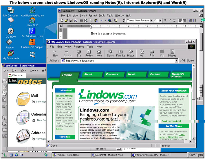 Автор: Владимир Мазепа. Посмотреть скриншоты: 1, 2.LindowsOS - операционная система, способная выполнять как программы Windows, так и программы Linux. Построена на ядре последней. Системные требования пока заявлены не полностью — частота процессора не указывается (называют лишь сами процессоры — Pentium и AMD), память 128 Мб, 1 Гб на жестком диске. Зато уже заявлена сравнительно небольшая цена ($99) и приемлемая политика лицензирования (лицензия будет выдаваться на одного человека, а не на один компьютер, как в Windows). До недавних пор Lindows оставалась этакой мечтой, к которой сам собой приклеился жаргонный термин «vaporware» — несуществующая программа, обладающая невероятными возможностями. Теперь, к счастью, это не так. Совсем недавно — 4 февраля, была оглашена версия Sneak Preview — версия, доступная лишь определенной группе людей, даже не бета, очень сырая, но, тем не менее, судя по официальным данным, уже обладающая возможностями, которых так ждали от Lindows. А чего же все ждали? Конечно, не все сразу — ожидать от сырой версии работоспособности всех Windows-программ пока не следует. Тем не менее, Sneak Preview уже оправдывает многие надежды. Чего так не хватает многим в Linux? Легкости в установке и работоспособности офисного пакета от Microsoft. Ну, еще многим нравится Internet Explorer. Именно о легкости установки и заявляют разработчики \. Известно, что устанавливать LindowsOS действительно легко. Дело в том, что у новой системы есть возможность устанавливать себя из Windows — эта возможность называется Friendly install. Вызываете из Windows программу установки, пара щелчков по ОК — и без всяких форматирований и разбиений всего за десять минут получаете еще одну операционную систему у себя на компьютере. Перезагрузка — и перед вами стартовое меню с выбором запускаемой операционной системы. При этом все папки и документы, существовавшие до установки Lindows, не теряются, более того, они из нее доступны. И еще установка Lindows сама перенесет в нее из Windows вашу электронную почту, «Избранное» и даже обои рабочего стола. А в подменю Windows Programs меню Launch появятся некоторые программы, ранее установленные в Windows, такие как Internet Explorer и программы пакета MS Office. Lindows может инсталлироваться и на чистую машину. Разработчики заявляют, что и в этом случае установка происходит очень просто и быстро — тоже десять минут. Однако создатели LindowsOS также честно заявляют, что пока еще не все так безоблачно. На некоторых компьютерах новая ОС даже не запустилась. Есть проблемы с тем же Outlook. Версия Sneak Preview не разрабатывалась для Office XP, так что пока мы видим скриншоты из Office 2000. Некоторые Windows-программы вообще не работают. К сожалению, даже грядущая версия 1.0 будет поддерживать лишь английский язык. Также следует заметить, что LindowsOS изначально нацеливается на пользовательский сектор рынка и пока не предназначается для серверов. Но как для ранней версии, достоинств у Sneak Preview вполне хватает, а сами разработчики обещают к выходу финального релиза исправить недостатки и добавить новые возможности. Sneak Preview не предназначается для каких-либо обзоров и тестов, так что об этой версии можно узнать лишь официальную информацию, которую я вам и пересказал. Что ж, будем ждать новостей от разработчиков, гадая, что из всего этого может получиться. А пока предлагаю познакомиться с историей Lindows, с тем, как все начиналось и как всему этому пытались помешать. А начало